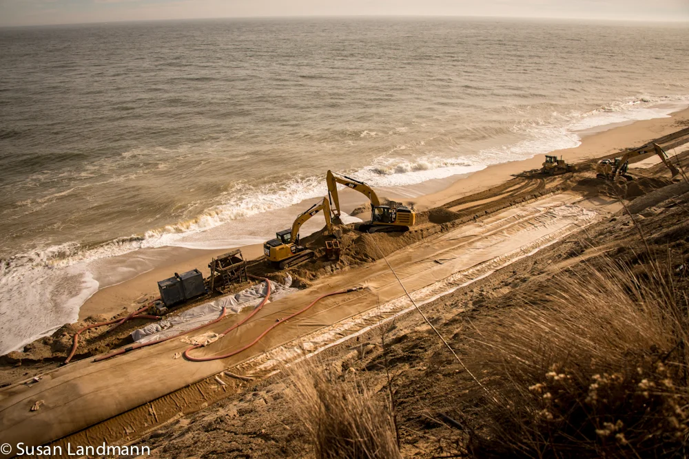The Siasconset Beach Preservation Fund’s (SBPF) controversial geotube project, installed at the base of the bluff in the northern Baxter Road area, is currently the subject of litigation between SBPF and the Town of Nantucket. The 900-foot hard-armoring project was constructed under a 30-day Emergency Order in the winter of 2013 and 2014. After a seven-month hearing process, the Nantucket Conservation Commission (ConCom) denied permitting for the structure, finding that it would cause adverse impacts and that there are less harmful alternatives. SBPF appealed the decision. The state Department of Environmental Protection (DEP) subsequently issued a Superseding Order of Conditions that, in effect, overruled the local decision. ConCom has, in turn, appealed the action of the DEP. The matter is pending in Superior Court.